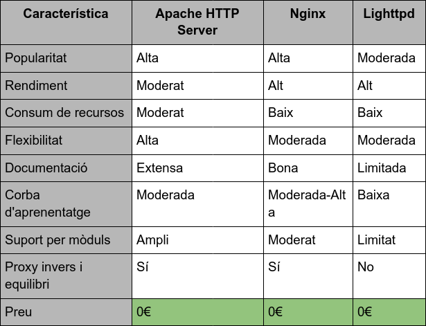Per tant, l’opció més recomanable seria Apache, ja que té unes característiques millor valorades entre la resta. A més, al ser més popular, la possible ajuda de cara a incidències seria major.