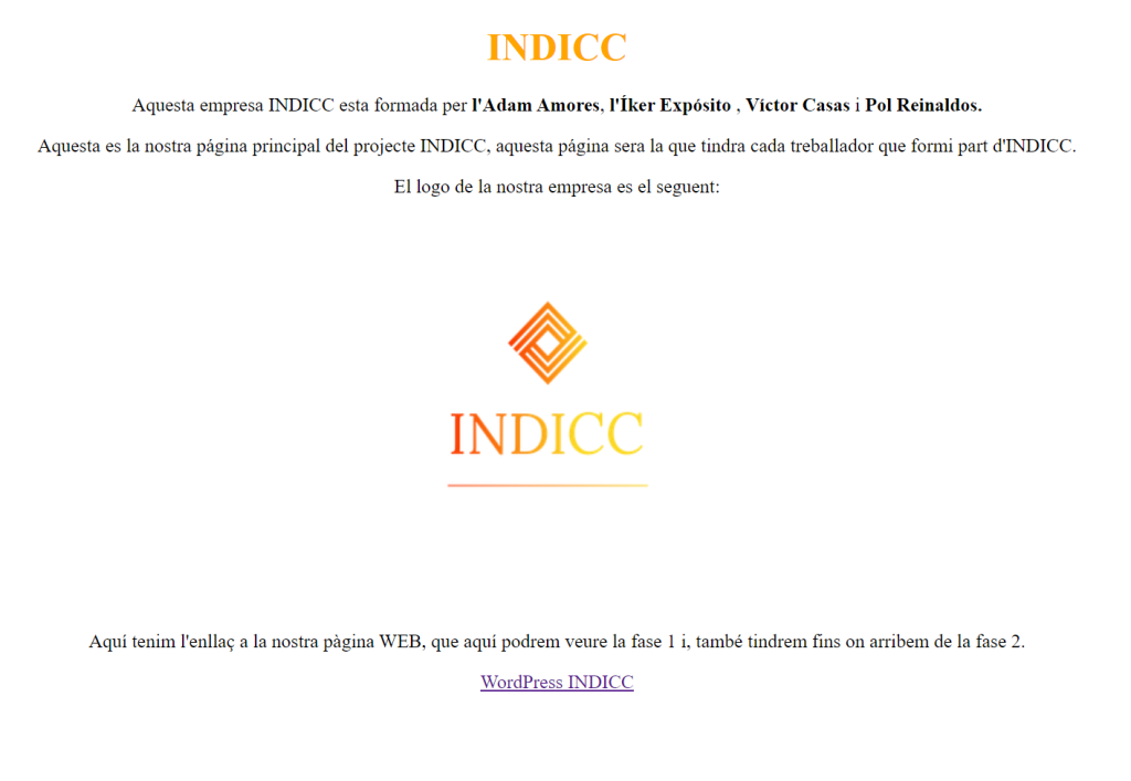 <p>Aquesta es la nostra pàgina principal del projecte INDICC, aquesta pàgina sera la que tindra cada treballador que formi part d’INDICC.</p> <!–Parragraf explicatiu de la pàgina–>