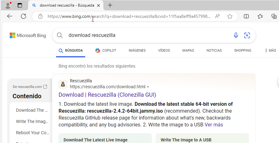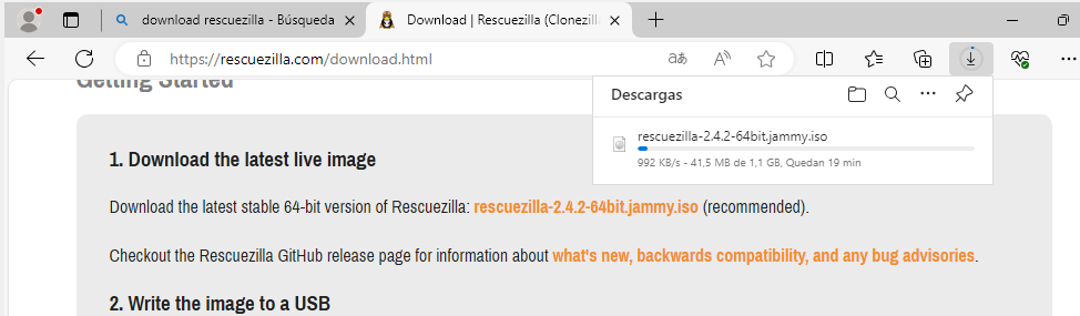 Per començar, anem al navegador web i busquem per descarregar el Rescuezilla.
