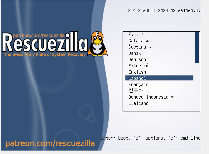 Seguidament, tenim ja el Rescuezilla instal.lat i ara comencem seleccionant l’idioma en el que el volem iniciar.