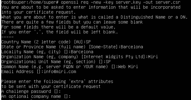 Despres utilitzem la comanda: openssl req -new -key server.key -out server.csr i posem les dades que ens demana.