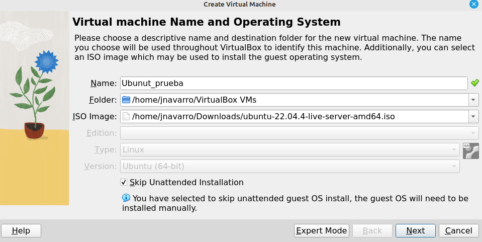 Per començar l’instal·lació afegim ‘nom de la MV’ li assignem ISO una imatge en aquest cas seria un UBUNTU SERVER.